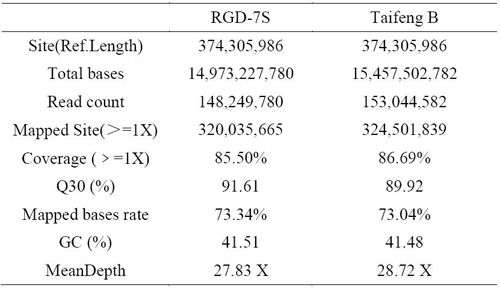 RGD-7S和TaifengB的重测序数据量分别为14,973,227,780 bp 和15,457,502,782 bp,测序深度达到27.83X和28.72X,测序质量(Q30)分别为91.61%和89.92%。将测序数据比对至参考基因组粳稻Nipponbare,其覆盖度分别达到了85.5% 和86.69%,这表明两个籼稻品种与粳稻Nipponbare之间存在着巨大的遗传差异,也反映出籼稻、粳稻亚种间经过遗传分化积累下的内在差异。