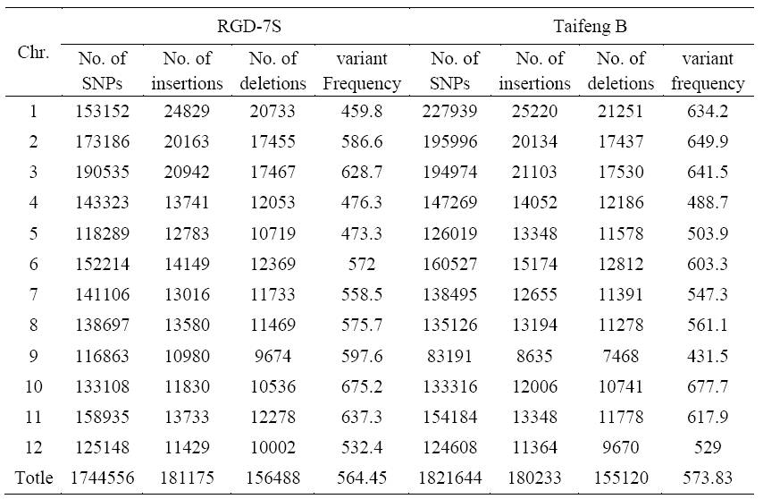 表2.品种RGD-7S和Taifeng B相对于粳稻基因组的SNPs及InDels的分布