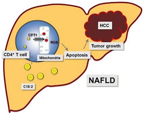为了了解非酒精性脂肪肝中CD4 + T细胞为什么减少,研究者研究了幸存的细胞观察到在非酒精性脂肪肝中细胞死亡增加。他们假设在非酒精性脂肪肝中肝细胞脂质积累过剩会导致CD4+T细胞的损失,对分离出来的细胞的研究显示CD4+ T细胞的生存被非酒精性脂肪肝的肝脏细胞释放的可溶因子所影响。由于已知游离的脂肪酸能改变免疫细胞的存活,研究者用非酒精性脂肪肝的肝脏细胞分泌的脂肪酸培养CD4+ T细胞,他们发现只有亚油酸增加CD4+ T细胞的死亡,而小鼠饲喂高亚油酸的饮食CD4+细胞数目减少,但CD8 + T细胞不减少。