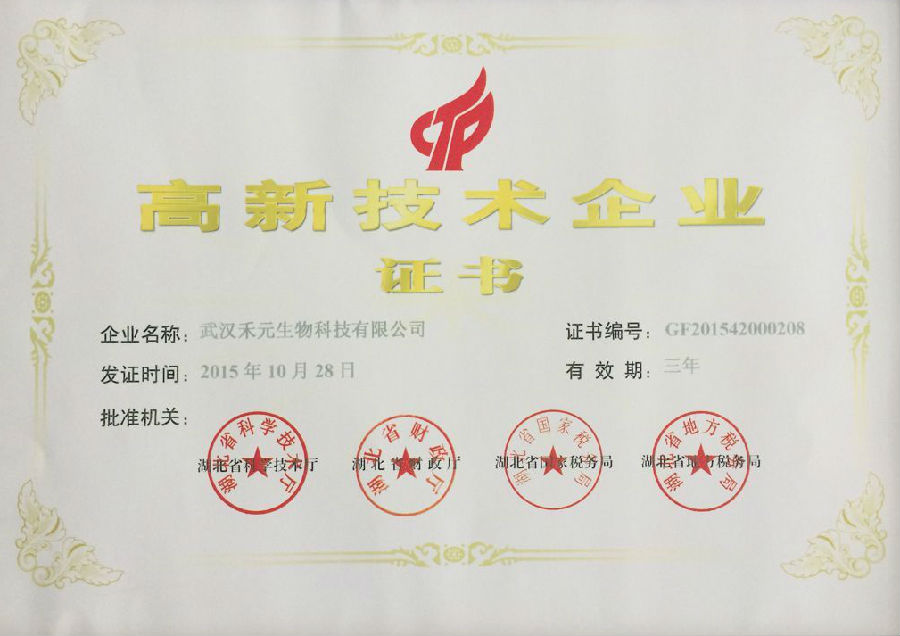 近日,武汉禾元生物科技股份有限公司收到由湖北省科学技术厅、湖北省财政厅、湖北省国家税务局、湖北省地方税务局联合颁发的《高新技术企业证书》,证书编号:GR201542000208,证书签发时间为2015年10月28日,有效期为三年。