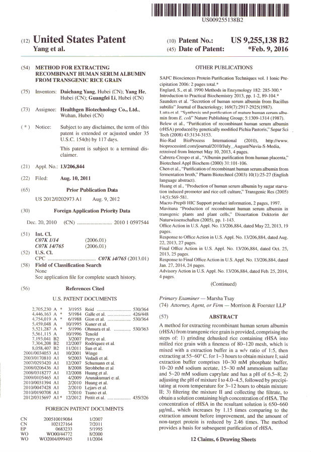 2016年2月9日,禾元生物获得美国专利局授权的专利证书颁发的《METHOD FOR EXTRACTING RECOMBINANT HUMAN SERUM ALBUMIN FROM TRANSGENIC RICE GRAIN》专利证书。