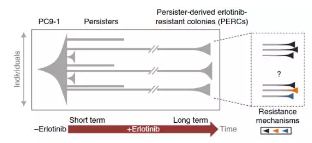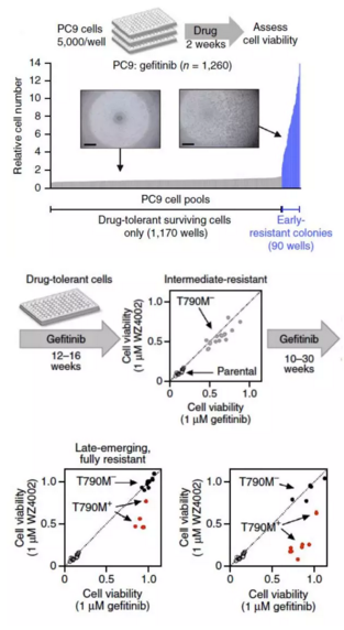 研究人员铺了1200个小孔的PC9细胞,加药EGFR TKI后产生了两种结果。一种是5-10%孔中的细胞在用药早期就显示出了耐受性,是T790M突变的;另一种是剩下的大多数孔里面都产生了一种耐受性细胞,尽管不是T790M突变,生长缓慢但坚决不死,并在后期自发形成了T790M突变。这两种细胞的基因表达谱以及对加药WZ4002(针对T790M突变)后产生凋亡的程度都不相同,对WZ4002应答不佳的细胞使用BCL-xL抑制剂后则凋亡率明显上升。