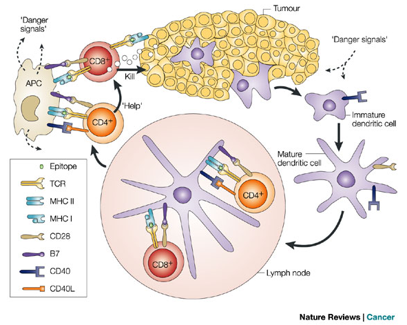 How the immune system targets tumors. Dendritic cells collect antigens from cancer cells and activate T-cells (CD4 and CD8), that attack the tumor.