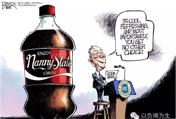 一张讽刺纽约市苏打水禁令的漫画。图中纽约市长布隆伯格手拿苏打水禁令,说“这(个禁令)很酷,很清爽,而且最重要的是,你别无选择!”。背后的大可乐上面写“保姆国家(nanny state)”。整张漫画嘲讽的是政府公权力对人民行为自由的越界干涉,也反映了在针对肥胖症的公共卫生活动中面临的两难选择。(图片来自www.pinterest.com)