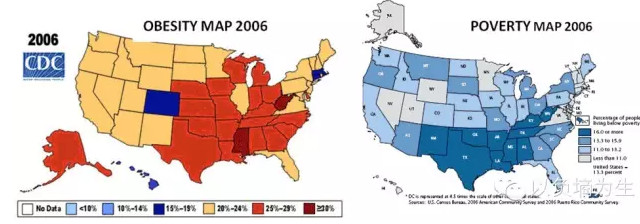 肥胖症当然是一个医学问题。但是同时它也是一个复杂的社会问题。就像我们讨论到的,它的复杂体现在个人自由和公共卫生的关系,也体现在个人行为控制、经济情况和病理学变化的关系上。一个非常敏感的话题就是在后工业化社会,肥胖是否确实和经济状况有相关性?一个潜在的可能是,在后工业化社会,反而是经济地位较低的贫穷人口更加容易肥胖!这可能是因为贫穷人口相对更缺少关于个人健康生活方式的教育、缺乏体育运动的时间、以及缺乏购买健康食品的金钱。图中显示的是美国肥胖症(左)和贫穷(右)地图,可以看到,肥胖州和穷州有高度的重合。(图片来自美国疾控中心)