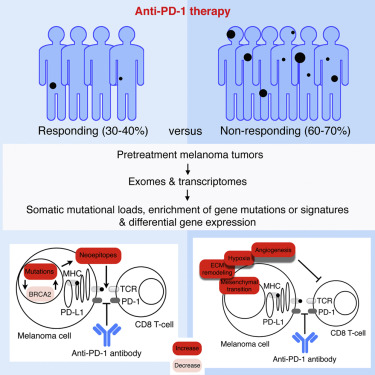 肿瘤特异性T细胞的释放是PD-1药物治疗黑色素瘤的主要mechanistic基础。在基因组层面上,整体突变负荷与PD-1疗法的临床响应相关。3月24日,发表在《细胞》杂志上的一项研究中,研究人员分析了治疗前黑色素瘤活组织样本的mutanomes和转录组,以期鉴定出影响患者对PD-1疗法敏感性或抵抗性的因素。结果发现,整体高突变负荷与改善生存相关,响应PD-1疗法的患者拥有丰富的BRCA2突变。
