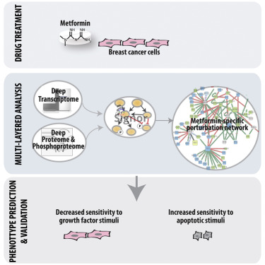 为了验证这一假设,研究人员观察了二甲双胍治疗乳腺癌细胞的状态变化。尽管基因表达差异常被用于研究细胞对“干扰”的响应,但细胞表型主要由所有表达的蛋白的浓度和活化度决定。3月23日,发表在《Cell Systems》杂志上的这项研究中,科学家们使用高分辨率质谱技术描述了二甲双胍介导的乳腺癌细胞蛋白质组和磷酸化蛋白质组的变化。