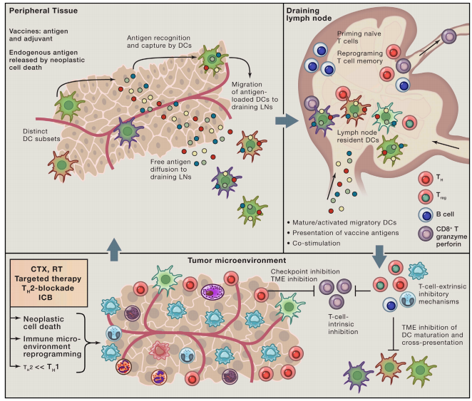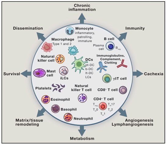 3月10日,《细胞》杂志上发表的这篇题为“The Basis of Oncoimmunology”的综述中,作者讨论了癌症免疫响应的组成、癌症中慢性炎症和Leukocyte Compartments的改变、基于TH2的抗癌疗法、T细胞免疫靶向治疗、微生物在调节系统癌症风险和响应治疗中的作用以及肿瘤免疫治疗模式等内容。以下是文中的部分图表: