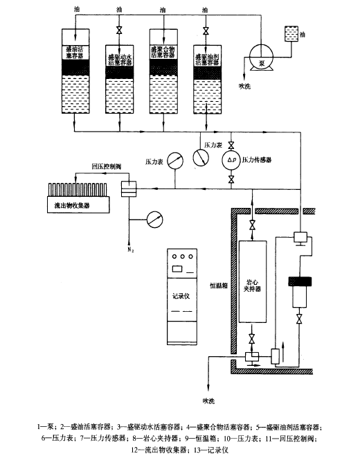 在油田开发过程中,通常称利用油藏天然能量开采的采油方式为一次采油。而在一次采油后,通过注水或非混相注气提高油层压力并驱替油层中原油的驱油方式称为二次采油。三次采油是指油田在利用天然能量进行开采和传统的用人工增补能量(注水、注气)之后,利用物理的、化学的、生物的新技术进行尾矿采油的开发方式。为了评价复合驱油体系性能,建立完善了一套系统的评价方法,岩心驱油实验流程示意图如下。