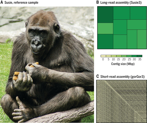 该研究从名叫Susie的西地大猩猩分离的外周血DNA产生了74.8倍的SMRT全基因组鸟枪序列。运用弦图(string graph)装配方法 和 Falcon的一致性算法产生了9.6Mbp的N50的重叠群和1个3.1 Gbp的拼接。从其它6只大猩猩基因组的短读长序列也被拼接以减少缺失位点的错误和最后组装的准确性。