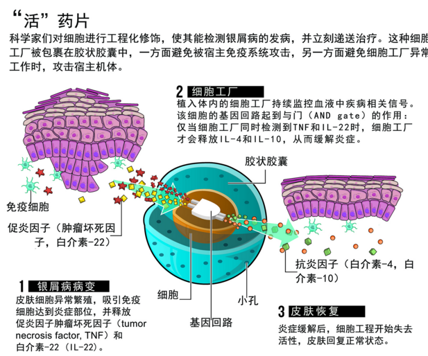 但是合成生物学家们的目标不仅仅是生产材料,他们通过复杂的基因修饰,赋予细胞更强大的生产能力。例如,利用细胞工厂合成各种开关和精密的感受器。瑞士联邦技术学院(Swiss Federal Institute of Technology, ETH)的Martin Fussenegger团队通过这种方法,得到了一种可检测血液中疾病相关代谢物,并引发治疗药物合成的生物医学感受器。在小鼠模型中,这些生物传感器成功预防了痛风与肥胖,并治疗了银屑病(图“活”药片)。