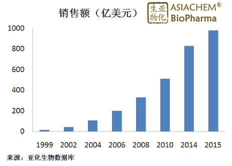单克隆抗体是近年来复合增长率最高的一类生物药物。1999年,全球单克隆抗体药物的市场销售额仅有12亿美元,而到了2002年,单克隆抗体的全球销售额已达40亿美元。随着已上市品种的销售额不断增长以及新适应症的批准和新品种的上市,单克隆抗体药物市场容量迅速攀升。资料显示,2015年全球单克隆抗体药物的销售额预计在980亿左右,成为全球生物技术药物领域发展的主旋律。