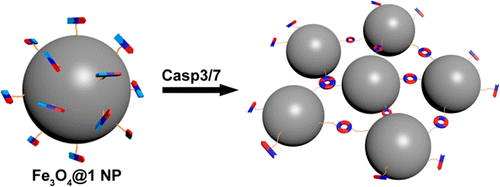 半胱天冬酶家族在介导细胞凋亡的过程中起着重要的作用,对半胱天冬酶的检测可以很好地监测肿瘤细胞的早期凋亡,从而评价肿瘤化疗的疗效,为后续治疗提供参考。核磁共振成像是一种无放射、非侵入的影像学技术,且成像参数多、扫描速度快、组织分辨率高,是常见的影像检查方式。磁性纳米粒子在生物成像方面已经得到广泛应用,大的磁性纳米粒子比目前常用的小磁性氧化铁纳米粒子在磁共振成像方面更具优越性,但前者在血液中被很快清除,导致组织的磁共振信号降低。