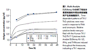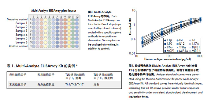 免疫反应时的细胞因子和趋化因子环境很复杂,3 或4 个细胞因子的分析可能无法说清整个故事。Multi-Analyte ELISArrayKit 快速筛查最多12 个细胞因子或趋化因子的定量变化,这些因子对特定免疫环境很重要。将大家熟悉的ELISA 操作与经过优化的分析相结合,这些分析使用了目前最灵敏的捕获和检测抗体组合,Multi-Analyte ELISArray Kit 让研究人员能够一次测定细胞培养基、血清或血浆样品中多个细胞因子的表达。