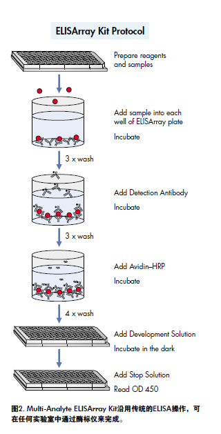 Multi-Analyte ELISArray Kit 是经过实验室优化的抗体对组合,根据其与不同免疫反应的相关性而安排在通路聚焦的阵列中。Multi-Analyte ELISArray Kit 一次产生了多个细胞因子或趋化因子的相关倍数变化,让您从整体上了解系统中细胞因子的表达变化。Single Analyte ELISA Kit使用经过实验室验证的相同试剂,以便利用标准曲线确定细胞因子的浓度。每个Multi-Analyte ELISArray Kit 都是完整的,提供了12 个8 联管,带有目标特异的捕获抗体,以及检测抗体、抗原标准品和ELISA 的显色试剂。