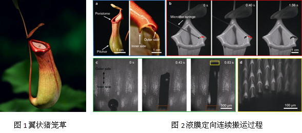 在这篇文章中,研究人员以翼状猪笼草为模型展开了研究。翼状猪笼草,又名红猪笼草,是菲律宾特有的热带食虫植物。在园艺上,翼状猪笼草是最容易栽培且栽培得最广泛的物种之一。在这里他们研究了翼状猪笼草的捕虫笼。他们首次发现了在口缘表面神奇的液膜连续定向搬运现象。作者们表示,研究成果为机械表面/界面的仿生设计与生物制造奠定了理论与技术基础。可应用于医疗器械、MEMS、航空航天等装备的表面/界面自润滑、抗磨损、防粘附等。