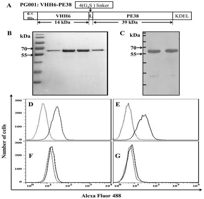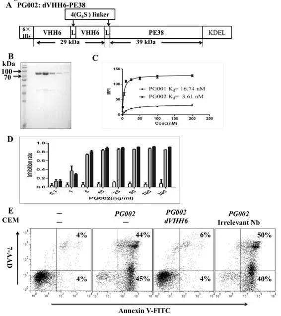 在临床需求的巨大推动下,汤金乐博士生和团队成员一道,通过提取免疫后的骆驼外周血淋巴细胞,构建了纳米抗体噬菌体文库,用生物淘洗的方法筛选获得抗CD7的纳米抗体。成功鉴定了具有高特异性和亲和力(~15nM)的抗CD7纳米抗体——VHH6。基于VHH6的单价免疫毒素(PG001)和双价免疫毒素(PG002)被证实对CD7阳性细胞保持有高度的特异性,亲和力分别约为16nM和4nM。这两种毒素高效地以抗原依赖型方式促进CD7阳性白血病细胞发生凋亡,但是对CD7阴性的人多发性骨髓瘤细胞和人肺癌细胞增殖的没有影响。特别需要指出的是,免疫毒素PG002对CD7阳性白血病细胞的半有效浓度范围为30pM—23pM,显示出PG001和PG002,特别是PG002在治疗CD7阳性白血病上的巨大潜力。此外,PG002在单剂量为100ng/ml浓度条件下就能有效介导新鲜收集的T-ALL和AML患者原代细胞凋亡。在异种移植肿瘤模型中,PG001和PG002能够防止CEM细胞的增殖,可显著延长小鼠的生存期。其中,PG002相比于PG001在肿瘤模型中的治疗效果更为突出。