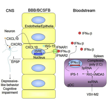 β-干扰素刺激血脑屏障表面细胞受体,导致病态行为