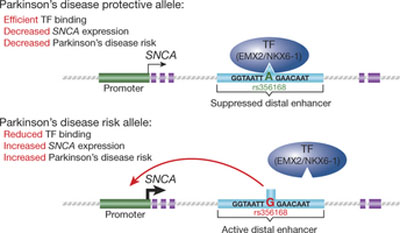 Jaenisch实验室的研究人员对于与α-synuclein基因在同一染色体上远距离的基因调节元件能否影响α-synuclein的细胞水平进行了分析。他们发现两个基因组关联的研究标记的风险因子位于一个假定的α-synuclein基因的增强子区域。