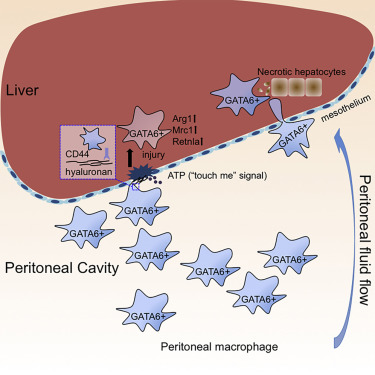 在存在于体腔内的几种类型的免疫细胞中,该研究特别观察了巨噬细胞(macrophage)——这些细胞对清除机体有害物质及微生物,如毒素和细菌,及清除死亡组织起关键作用。通过观测肝脏周围腹腔中的细胞,这项研究证实巨噬细胞在这一腔隙中巡逻,一旦器官遭受损伤,巨噬细胞会将自身粘附到受损区域实现快速的修复。