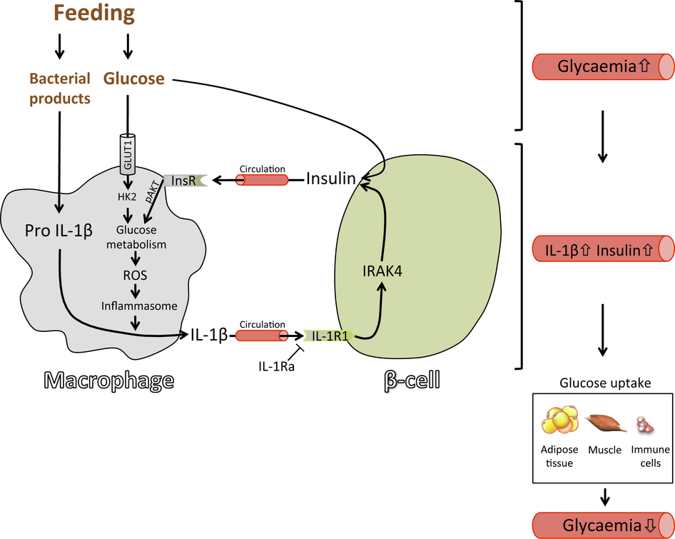 餐后巨噬细胞来源的IL-1β刺激胰岛素,并且协同促进葡萄糖利用和炎症反应的模式图:食物摄入增加腹膜巨噬细胞的数量。这些巨噬细胞被细菌产物和葡萄糖刺激以增加IL-1β的产生和释放。增加的IL-1β浓度将通过高度表达的IL-1受体1(IL-1R1)和IL-1受体相关激酶-4(IRAK4)的增强胰腺β细胞分泌胰岛素。胰岛素与巨噬细胞上的受体InsR结合,通过葡萄糖转运蛋白GLUT1,AKT磷酸化(pAKT)以及己糖激酶2(HK2)和糖酵解活性促进葡萄糖摄取,导致ROS产生。这进一步通过NLRP3炎症小体刺激巨噬细胞产生的前IL-1β成熟。最后,IL-1β和胰岛素的水平增加刺激葡萄糖摄入肌肉,脂肪组织和免疫细胞,从而减少血糖,限制餐后炎症反应。