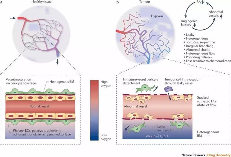 尽管肿瘤拥有丰富的血管,但由于其结构和功能的异常,肿瘤血管的功能并不佳。它们不能向肿瘤运送足够的血液,限制了氧气和营养物质的供应,从而产生不利的微环境,促使某些癌细胞通过血管间隙逃逸,并转移至其他部位。异常的肿瘤血管也可能干扰抗肿瘤免疫细胞和药物的作用。
