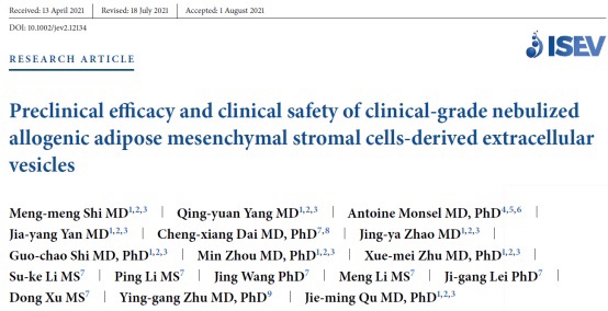 2021年8月,瞿介明教授团队首次验证经雾化吸入异体人源间充质基质细胞外囊泡在临床应用中的可行性及安全性,相关研究成果刊发在国际顶级权威杂志Journal of Extracellular Vesicles(IF:25.841)上。