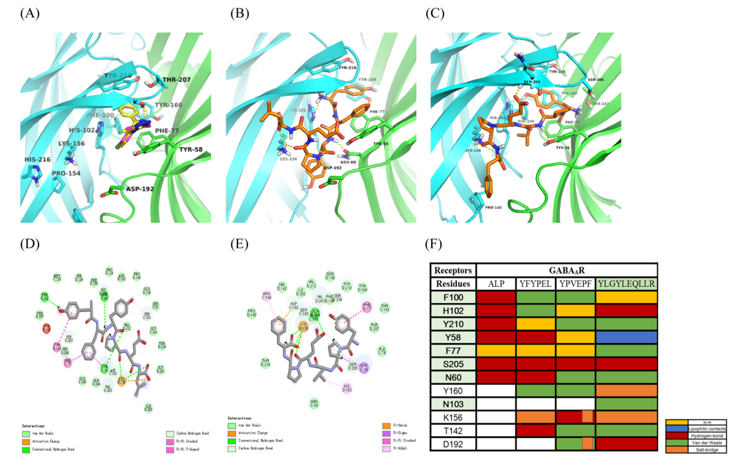 为了揭示配体-受体相互作用机制,YFYPEL 和 YPVEPF 通过 CDOCKER 与 GABAAR 对接。肽-GABAAR 复合物的 3D 和 2D 结构如下图 A 所示。YFYPEL 和 YPVEPF 均位于 GABAAR 的深层活性通道中,它们被 α1+/γ2- 口袋中的 BZD 位点包围(下图 B、C)。如下图 D、E 中,YFYPEL 和 YPVEPF 通过范德华力和次级相互作用(如氢键、π-π 堆积、盐桥和亲脂力)激活 GABAAR。