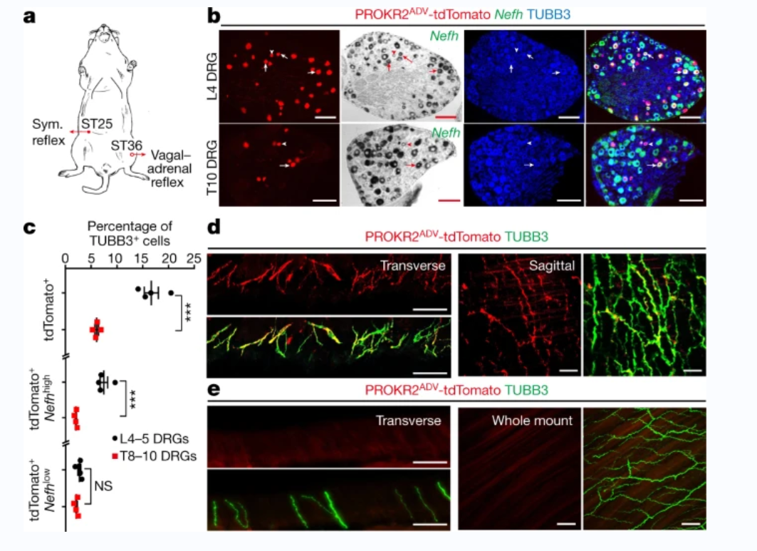 在这次的研究中,研究人员通过在小鼠身上进行的一系列实验来验证了这个假设。首先,他们确定了一个由PROKR2cre受体为标志物的小鼠感觉神经元亚群,并且发现这些神经元在后肢深层筋膜组织(如骨膜)中的数量是腹部筋膜(如腹膜)的3-4倍。这对于驱动迷走神经-肾上腺轴是至关重要的。