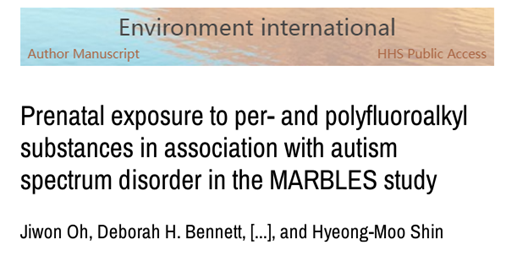 [2]Oh J, Bennett DH, Calafat AM, et al. Prenatal exposure to per- and polyfluoroalkyl substances in association with autism spectrum disorder in the MARBLES study. Environ Int. 2021 Feb;147:106328. doi: 10.1016/j.envint.2020.106328. Epub 2020 Dec 30. PMID: 33387879; PMCID: PMC7856021.