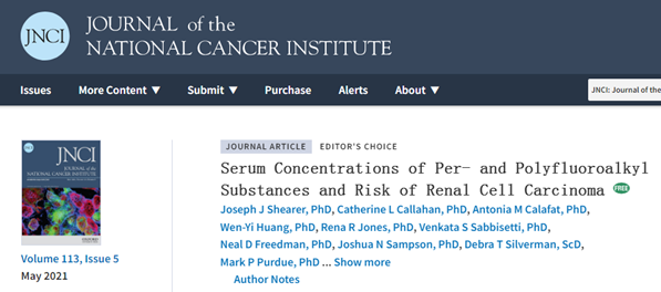 [3]Shearer JJ, Callahan CL, Calafat AM, et al. Serum Concentrations of Per- and Polyfluoroalkyl Substances and Risk of Renal Cell Carcinoma. J Natl Cancer Inst. 2021 May 4;113(5):580-587. doi: 10.1093/jnci/djaa143. PMID: 32944748; PMCID: PMC8096365.