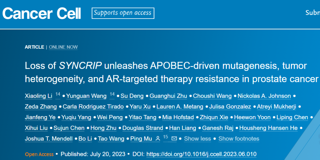 2023年7月20日,德克萨斯大学西南医学中心牟平团队在Cancer Cell 在线发表题为“Loss of SYNCRIP unleashes APOBEC-driven mutagenesis, tumor heterogeneity, and AR-targeted therapy resistance in prostate cancer”的研究论文,该研究发现SYNCRIP是一种内源性分子制动器,可以抑制前列腺癌(PCa)中APOBEC驱动的突变。