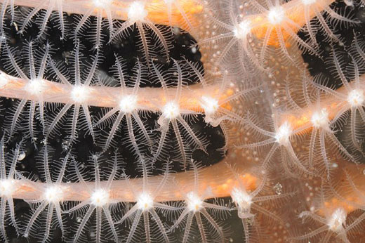 美丽的无脊椎动物海笔,如此命名是因为其外形类似于一个作家的羽毛笔,也像一棵圣诞树。海笔是由许多称为水螅虫的小动物群居而形成的。海笔的下半部分固定在泥沙中,上半部分生有许多水螅虫。一碰触它就会发出磷光。