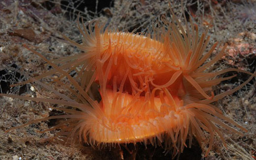 阿盖尔郡林尼湖的火焰贝壳层,这是在西海岸发现的罕见的具有鲜艳的橙色摄食触手的神秘物种