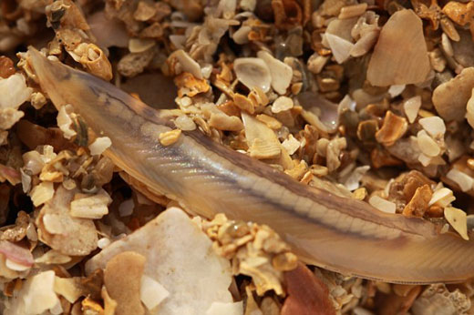 其它的发现包括外形似无眼无明确头部的身体细长的文昌鱼。5亿年前,地球上最早的由无脊椎到脊椎的过渡——脊索动物在海洋里出现,这就是文昌鱼。经过了漫长的岁月,文昌鱼演化为各种脊椎动物。科学家今年在苏格兰东北部奥克尼群岛Tankerness水域发现了珍稀罕见的文昌鱼。文昌鱼没有真正的头和脑,它是既象鱼又象蠕虫的动物,但血统上跟鱼及蠕虫相差很远。它的脊索纵贯全身,构成身体中央的支柱,而且脊索延伸到神经管的前面,故称头索动物。神经索前端略膨大,但无大脑。血液沿腹侧向前流,沿背侧向后流,但无明显的心脏。科学家最近对文昌鱼的一个物种进行了基因组测序,试图了解脊椎动物的起源。
